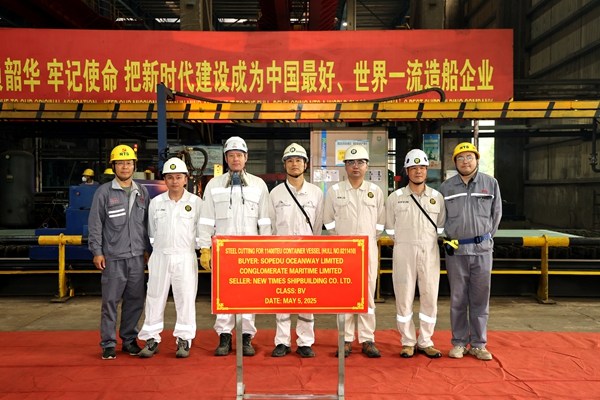 7/5/2025 On May 5, 2025, the steel cutting of 10# 11400 TEU Container Vessel bearing builder's hull no.0211410 has been carried out successfully by New Times Shipbuilding Co., Ltd. The representatives from the shipyard, the Owner CONGLOMERATE MARITIME LIMITED together with the representatives from BV classification society attended and witnessed this event.