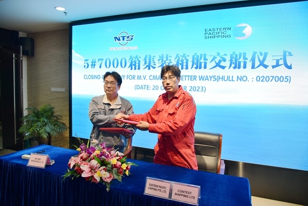 24/10/2023 On October 20, 2023, the closing ceremony for 5# 7000 TEU Container Vessel with Builder's Hull No.0207005 was held at the meeting room on 8th floor of New Times Office Building. Our Executive Deputy General Manager Mr. Zhang Yuyong, Deputy General Manager & Executive Director Mr. Yuan Heng and owner's representative were present. The vessel was smoothly and successfully delivered by us and accepted by the Owner.