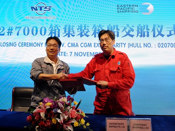 7/11/2023 On November 7, 2023, the closing ceremony for 2# 7000 TEU Container Vessel with Builder's Hull No.0207002 was held at the meeting room on 8th floor of New Times Office Building. Our CEO Mr. Liu Haijin, Executive Deputy General Manager Mr. Zhang Yuyong and owner's representative were present. The vessel was smoothly and successfully delivered by us and accepted by the Owner.