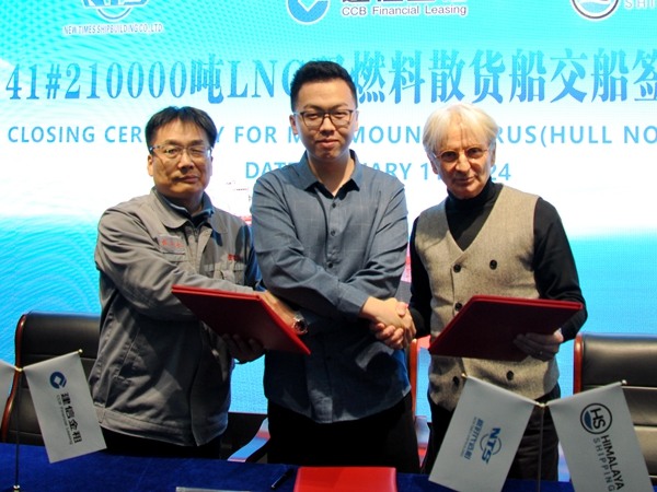 12/1/2024 On January 11, 2024, the closing ceremony for 41# 210,000 DWT Bulk Carrier with Builder's Hull No.0120841 was held at the meeting room on 8th floor of New Times Office Building. The representatives from the Owner and the representatives from CCB Financial Leasing Co., Ltd. were present. Our Executive Deputy General Manager Mr. Zhang Yuyong, Site Manager Mr. Davor Radic and Manager of Ship Leasing Dept. of CCB Financial Leasing Co., Ltd. Mr. Zhang Haocong signed the delivery documents. The vessel was smoothly and successfully delivered by us and accepted by the Owner.