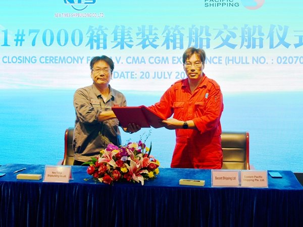 20/07/2023 On July 20, 2023, the closing ceremony for 1# 7000 TEU Container Vessel with Builder's Hull No.0207001 was held at the meeting room on 8th floor of New Times Office Building. Our CEO Mr. Liu Haijin, Executive Deputy General Manager Mr. Zhang Yuyong, Deputy General Manager & Executive Director Mr. Yuan Heng and owner's representative were present. The vessel was smoothly and successfully delivered by us and accepted by the Owner.