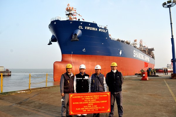 14 March 2024 On March 12, 2024, the launching of one 50,000 DWT Product Oil/Chemical Tanker (IMO Type 2) with Hull No.0405037 has been carried out successfully by New Times Shipbuilding Co., Ltd. The representatives from the owner CDB Leasing (International) Co., Ltd. and the representatives from the classification societies DNV and CCS attended and witnessed the ceremony together.