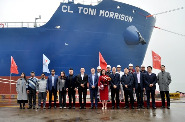29 March 2024 On March 28, 2024, we held naming ceremony for one 50,000 DWT Product Oil/Chemical Tanker (IMO Type 2) with Hull No.0405036. Our CEO Mr. Liu Haijin, Executive Deputy General Manager Mr. Zhang Yuyong, Deputy General Manager & Executive Director Mr. Yuan Heng, Chariman of Shandong Shipping Tanker Co., Limited Mr. Xu Tao, Deputy General Manager of Shandong Shipping Tanker Co., Limited Mr. Liu Youhong and Mr. Zhang Hao, the representatives from CDB Leasing (International) Co., Ltd. Mr. Zhao Deli attended this ceremony. Godmother Mrs. Xu Fei named the vessel for "CL TONI MORRISON".