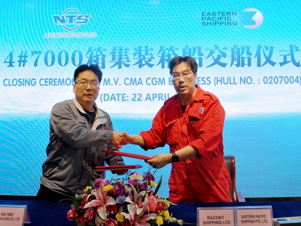 25 April 2024 On April 22, 2024, the closing ceremony for 4# 7000 TEU Container Vessel with Builder's Hull No.0207004 was held at the meeting room on 8th floor of New Times Office Building. Our CEO Mr. Liu Haijin, Executive Deputy General Manager Mr. Zhang Yuyong and owner's representative were present. The vessel was smoothly and successfully delivered by us and accepted by the Owner.