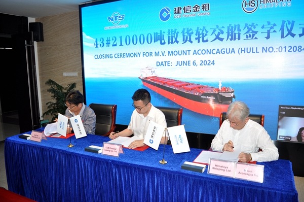 7 June 2024 On June 6, 2024, the closing ceremony for 43# 210,000 DWT Bulk Carrier with Builder's Hull No.0120843 was held at the meeting room on 8th floor of New Times Office Building. The representatives from the Owner and the representatives from CCB Financial Leasing Co., Ltd. were present. Our Executive Deputy General Manager Mr. Zhang Yuyong, Site Manager Mr. Davor Radic and Manager of Ship Leasing Dept. of CCB Financial Leasing Co., Ltd. Mr. Zhang Haocong signed the delivery documents. The vessel was smoothly and successfully delivered by us and accepted by the Owner.
