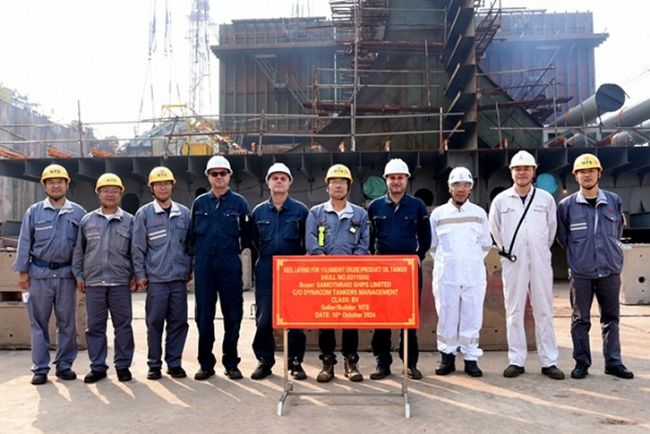 15 October 2024 On October 10, 2024, the keel laying of one 115,000 DWT Crude/Product Oil Tanker bearing builder's hull no.0311550 has been carried out successfully by New Times Shipbuilding Co., Ltd. The representatives from Dynacom Site Office, BV classification society and shipyard attended and witnessed the ceremony together.