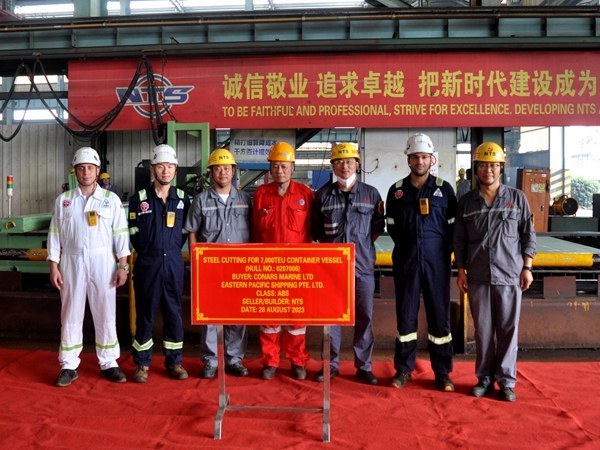 28/08/2023 On August 28, 2023, the steel cutting of one 7000 TEU Container Vessel bearing builder's hull no.0207006 has been carried out successfully by New Times Shipbuilding Co., Ltd.. Our Manager of Production Dept. Mr. Chen Yuefeng, the representatives from the Owner EPS and ABS Classification Society attended and witnessed this event.