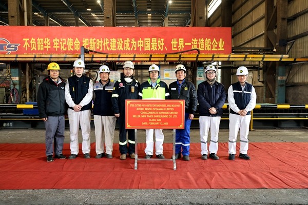 17 February 2025 On February 13, 2025, the steel cutting of 7# 11400 TEU Container Vessel bearing builder's hull no.0211407 has been carried out successfully by New Times Shipbuilding Co., Ltd. The representatives from the shipyard, the Owner CONGLOMERATE MARITIME LIMITED together with the representatives from ABS classification society attended and witnessed this event.
