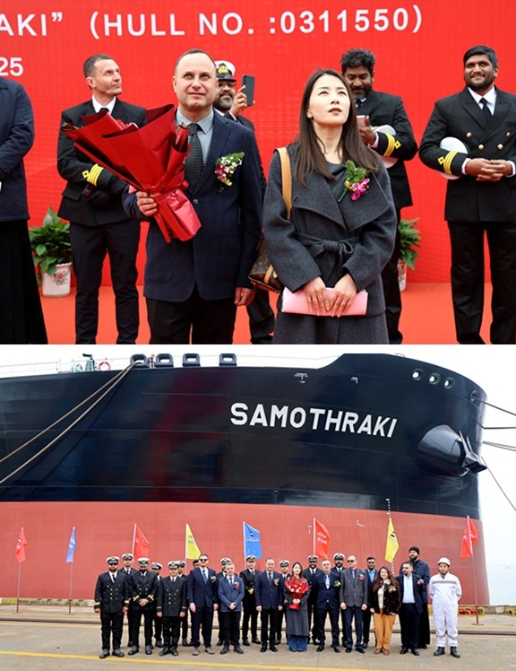 12 March 2025 On 7 March, 2025, we held naming ceremony for 50# 113,500 DWT Crude/Product Oil Tanker with Builder's Hull No.0311550. Our Executive Deputy General Manager Mr. Zhang Yuyong, Dynacom Site Manager Mr. Romeo Mustata, BV Site Manager Mr. Luo Cheng and other VIP guests attended this ceremony. Godmother Ms. Jiang Yan named the vessel for "Samothraki".