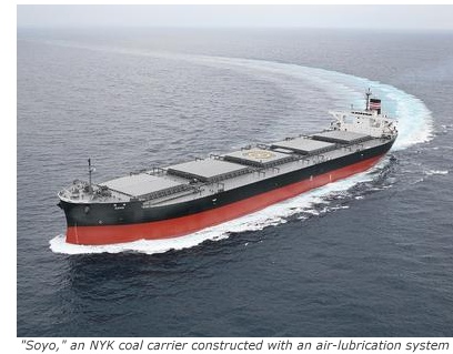 One of the NYK Group’s new environmental engineering technologies to improve fuel efficiency is an air-lubrication system featuring a blower that provides air to the vessel bottom, thus reducing friction between the vessel bottom and the sea. After this system was installed on two of the group’s vessels and its benefit confirmed, an air-lubrication system using the vessel’s scavenging air was additionally developed and installed on a new coal carrier delivered to NYK. This was the first time for a coal carrier anywhere in the world to be equipped with such as system.