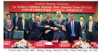 On October 29, the shipbuilding company held a signing ceremony that was attended by Wang Yong, president of Hudong-Zhonghua Shipbuilding; Hu Kai, vice-president of China Shipbuilding Trading Co. (International) Ltd.; Hans Feringa, president of Stolt Tankers; and Kenichi Miki, NYK corporate officer.