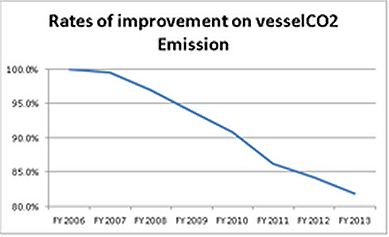 In fiscal 2013, NYK achieved an 18.1 percent reduction in CO2 emissions, significantly exceeding the goal established in 2008 in the company’s "New Horizon 2010" medium-term management plan calling for a 10 percent reduction by fiscal 2013 in the CO2 emission rate per unit of transportation from vessels compared with the rate recorded in 2006.