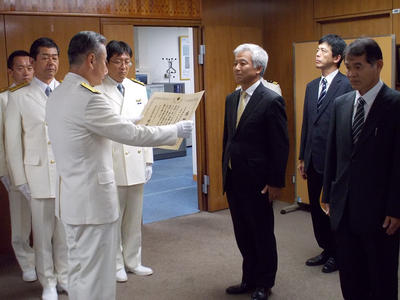 September 25, 2014 On September 12, the NYK-operated and managed LNG carrier LNG Flora was recognized by the commandant of the Japan Coast Guard for the long-term contribution the ship has made by providing seawater temperatures to the Japan Coast Guard’s Hydrographic and Oceanographic Department, thus contributing greatly to the understanding of oceanic conditions.* The Japan Coast Guard uses the seawater temperatures in a variety of marine research and information services, such as chart development and responses to marine environmental issues and disasters, including earthquakes. In 2012, the NYK-managed LNG carrier Broog was recognized for its contributions.** An award ceremony was held at the commandant’s room in Tokyo on September 12 and attended by NYK LNG Shipmanagement Ltd. president Hiroshi Yonezawa, as a representative of NYK concerned parties. NYK is encouraged by this honor and will continue to provide maritime environment information for the achievement of a better global society.