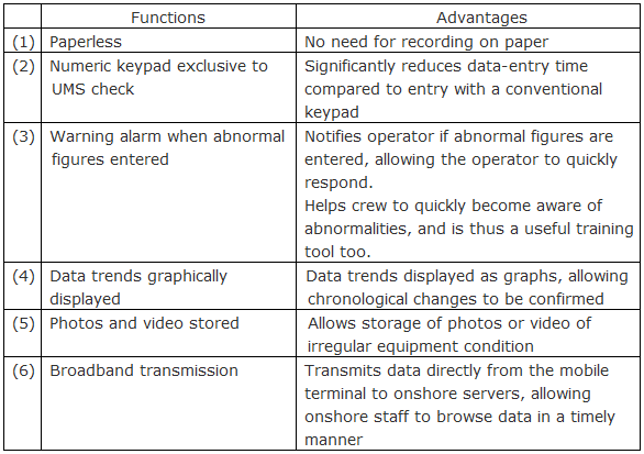 July 13, 2015 Nippon Yusen Kabushiki Kaisha Monohakobi Technology Institute NYK and the Monohakobi Technology Institute (MTI; head office: Chiyoda-ku, Tokyo; president: Makoto Igarashi) have jointly developed a Unmanned Machinery Space (UMS) check system, the first time a Japanese shipping company has developed such a system. Before an engine plant and equipment are operated unattended (e.g., at night), measurements need to be made, and taking such measurements is called an “UMS check.” In a conventional UMS check, the person in charge monitors equipment by conducting a large number of checks, manually recording the collected data on paper. This new electronic UMS check has been specialized for mobile devices, and NYK aims to introduce it aboard its owned vessels by the end of this year. System features are as below. Features of the Electronic UMS Check System