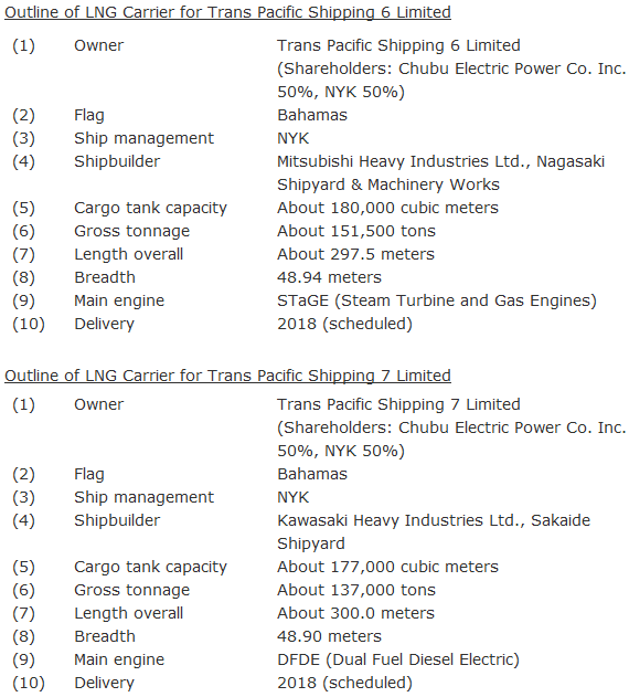 NYK Concludes Time-charter Contracts for Two New LNG Carriers for Freeport LNG Project September 9, 2015 Two joint-venture companies that NYK has established with Chubu Electric Power Co. Inc. each concluded a time-charter contract for a new liquefied natural gas (LNG) carrier with Chubu Electric Power Co. Inc. In addition, one of the joint-venture companies, Trans Pacific Shipping 6 Limited, concluded a shipbuilding contract with MI LNG Company Limited,* and other joint-venture company, Trans Pacific Shipping 7 Limited, concluded a shipbuilding contract with Kawasaki Heavy Industries Ltd. These new ships will be managed by NYK after being delivered in 2018 and assigned to transport LNG for a 20-year period from the Freeport LNG Project, in which Chubu Electric Power Co. Inc. has an equity interest. In accordance with its “More Than Shipping 2018” medium-term management plan, NYK will continue its efforts to be a part of stable and economical LNG transport. * MI LNG Company Limited A joint venture established in April 2013 by Mitsubishi Heavy Industries Ltd. (equity ownership 51%) and Imabari Shipbuilding Co. Ltd. (49%) for designing and marketing new LNG carriers.