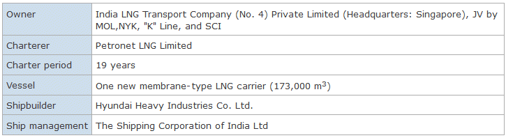 December 07, 2016 Mitsui O.S.K. Lines Ltd. Nippon Yusen Kabushiki Kaisha Kawasaki Kisen Kaisha Ltd. The Shipping Corporation of India Ltd. A consortium comprising Mitsui O.S.K. Lines, Ltd. (MOL), Nippon Yusen Kabushiki Kaisha (NYK), Kawasaki Kisen Kaisha, Ltd. ("K" Line), and the Shipping Corporation of India Ltd. (SCI) took delivery of a new LNG vessel on November 30, 2016, in South Korea. The vessel, PRACHI, has a capacity of 173,000 m3 and was built to order by Hyundai Heavy Industries Co. Ltd. based on a long-term time charter contract with Petronet LNG Limited (PLL). A naming ceremony for the ship was held on October 18, 2016. PLL, India's first importer of LNG, currently brings in 7.5 million tons of LNG a year from Qatar using three LNG carriers. PRACHI is the fourth vessel for the transport of LNG to India and will be employed in the Gorgon LNG Project in Australia. SCI has been operating and managing all the LNG tankers that are under long term charter with Petronet LNG Ltd. SCI also takes over as manager of PRACHI since delivery on November 30, 2016. The four-company consortium will make every effort for safe transportation using this advanced new vessel, which is expected to contribute to the steady supply of LNG to India as energy demand continues to grow.