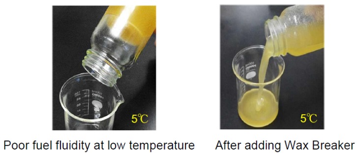 Improves Oil Fluidity at Low Temperatures for Safer Operations November 16, 2017 NYK and Nippon Yuka Kogyo Co. Ltd. (head office: Yokohama; president: Kazutoshi Kamata), an NYK Group company, have jointly developed an innovative fuel additive, "Wax Breaker," which is added to MGO and MDO* to prevent coagulation at low temperature. Marine fuel oil contains a lot of waxes** that can possibly coagulate when the ship enters cold areas. The waxes can solidify as the temperature of the fuel oil tank drops, and engine troubles can then result. The new agent, “Wax Breaker," can get between the molecules of paraffin crystals that cause coagulation, prevent them from growing larger, and thus prevent coagulation. This can improve the fluidity of fuel at low temperature and prevent potential accidents. The NYK Group will continue to promote new technologies for safe shipping. * MGO and MDO MGO (Marine Gas Oil) and MDO (Marine Diesel Oil) are standard marine fuel oils that are similar to light oil and A heavy oil, and have a much lower viscosity than C heavy oil. In recent years, many waxes have been confirmed to be in some oils. ** Waxes Oil and fat substances that solidify when cooled, like candle wax. Wax components can be found in crude oil.