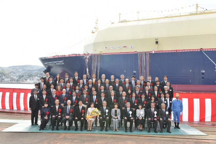 December 14, 2017 On December 13, a naming ceremony was held at the Nagasaki Shipyard & Machinery Works of Mitsubishi Heavy Industries Ltd. for a new liquefied natural gas (LNG) carrier that NYK had ordered from MI LNG Company Ltd.* The ceremony was attended by Toshihiro Sano, chairman of TEPCO Fuel & Power Inc. (headquarters: Tokyo, president: Seiji Moriya); Hendrik Gordenker, chairman of JERA Co. Inc. (headquarters: Tokyo, president: Yuji Kakimi); ** Yasumi Kudo, chairman of NYK; and a number of related parties. At the ceremony, the ship was named “Pacific Mimosa” by Mr. Sano of TEPCO Fuel & Power, and the ceremonial rope holding the vessel in place was cut by Mr. Sano’s wife. The ship’s main port of call will be in Australia, and the vessel derives its name from Australia’s national flower, which is part of the Mimosa family. The ship will be delivered in March 2018 and assigned to transport LNG for JERA from the Wheatstone LNG project — in which JERA, Mitsubishi Corporation (head office: Tokyo; president and CEO: Takehiko Kakiuchi), and NYK participate. LNG Marine Transport Ltd.*** will be responsible for the operational management of the vessel. NYK will continue its efforts for stable energy transport. * MI LNG Company, Ltd. Jointly established by Mitsubishi Heavy Industries Ltd. and Imabari Shipbuilding Co. Ltd. **JERA Co. Inc. Jointly established by TEPCO Fuel & Power Inc. and Chubu Electric Power Co. Inc. *** LNG Marine Transport Ltd. Jointly established by JERA Co. Inc. (70%), Mitsubishi Corporation (15%), and Nippon Yusen Kaisha (15%). Responsible for operational management of the maritime transport of LNG. Outline of “Pacific Mimosa” Length overall: 288 meters Breadth: 48.94 meters Main engine: steam turbine Gross tonnage: 138,000 tons Cargo tank capacity: 155,300 cubic meters Shipbuilder: Mitsubishi Heavy Industries Shipbuilding Co. Ltd. Flag: Japan