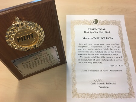 June 26, 2018 The containership NYK Lyra has been recognized with the Best Quality Ship Award for 2017 by the Japan Federation of Pilots’ Associations (JFPA).* The Best Quality Ship Award was founded in fiscal 2003 with the aim of enhancing awareness of not only safe vessel operations but also the need for environmental conservation within our ports and oceans. Comprehensive evaluations by pilots were done for vessels that requested pilot operations at pilotage districts throughout Japan during the months of September and October 2017, and seven vessels were recognized for their excellent operations. The ships were evaluated for their sure implementation of safety measures, sufficient training of bridge crew in Bridge Resource Management** directive and command systems on board the vessel, crew awareness for safe operations, and systems in place for easing cooperation with pilots. The NYK Group will continue its efforts to ensure safe operations, positioning safety as our most important task. About NYK Lyra Length Overall: 288.59 meters Breadth: 40.00 meters Summer Load Draft: 14.022 meters Gross Tonnage: 75,201 tons Deadweight Tonnage: 78,231 tons Ship Management: NYK Ship Management Pte. Ltd. * Japan Federation of Pilots’ Associations (JFPA): Under the revised Pilotage Law, the JFPA was founded on April 1, 2007, as an incorporated national federation composed of district-wide pilot associations. ** Bridge Resource Management: Management method employing the concept of Cockpit Resource Management developed by the National Aeronautics and Space Administration (NASA). This method aims to utilize human resources on the bridge from where a ship is controlled, and to improve human interface. NYK Line, press release |