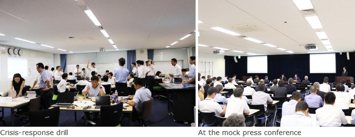 August 2, 2018 On August 1 as part of the company’s Remember Naka-no-Se Campaign, NYK conducted a crisis-response drill based on the scenario of a serious accident occurring on an NYK-owned LNG (liquefied natural gas) carrier. Cooperation from the Maritime Bureau within Japan’s Ministry of Land, Infrastructure, Transport and Tourism (MLIT), the 3rd Regional Coast Guard Headquarters of Japan, the Maritime Disaster Prevention Center (MDPC), and related parties enabled this drill to be realistic and practical as the participants reviewed their possible response to a significant accident involving an LNG carrier and examined measures with one another. About the Campaign The Remember Naka-no-Se safety campaign is conducted for two months from July 1 every year, and draws on the lessons learnt from the crude oil tanker Diamond Grace oil spill to encourage all NYK Group members to bear in mind the importance of safe operations. Drill summary Rudder failure occurred while the LNG carrier was sailing to the north of Tokyo Bay, and the ship collided with a containership that was sailing to the south. The LNG carrier lost control as it took in water from the damaged area. 1) NYK set up a crisis-management headquarters upon receiving an urgent report from the LNG carrier’s ship-management company about the accident. 2) NYK reported information about the accident to MLIT’s Maritime Bureau, the Japan Coast Guard, and related parties. 3) NYK considered how to control the inflammable gas and rescue the injured by coordinating with MLIT, the Japan Coast Guard, the MDPC, and related parties. 4) NYK made press releases as the situation progressed and held a mock press conference where Hitoshi Nagasawa, NYK representative director and executive vice-president corporate officer, and Tomoyuki Koyama, NYK managing corporate officer, explained the accident to the press.