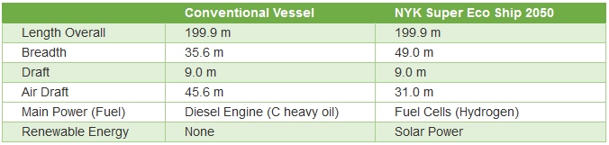 November 14, 2018 As a part of the NYK Group’s medium-term management plan “Staying Ahead 2022 with Digitalization and Green,” a new future concept ship has been designed by incorporating innovative technologies that will result in an emission-free vessel — the “NYK Super Eco Ship 2050.” 1. Background The NYK Group’s mission of “Bringing value to life” and the company’s basic philosophy of “contributing to the betterment of societies” has inspired the group to positively address the tough issues that challenge our society. In fact, NYK’s medium-term management plan includes the group’s intent to integrate environmental, social, and governance (ESG) initiatives into management strategy by establishing new medium- to long-term environmental targets.* To achieve these goals, NYK has teamed up with MTI and Elomatic, an engineering and consulting company based in Finland, to review the technical advances conceived for NYK’s previous concept ship (i.e., NYK Super Eco Ship 2030, created in 2009) and design an updated version that makes use of advances in technology in the realm of green and digitalization initiatives that embody the group’s basic philosophy. 2. About NYK Super Eco Ship 2050 This concept ship has been crafted as a 2050-model pure car and truck carrier (PCTC). The power needed to operate the ship has been cut by 70 percent by remodeling the hull to decrease water friction, reducing the weight of the hull, introducing fuel cells for electric propulsion, and relying on other highly efficient propulsion devices. Instead of fossil fuels, power for the ship would come from solar energy and hydrogen produced from renewable energy sources, all of which would lead to a reduction of CO2 by 100 percent and thus result in a zero-emission vessel.