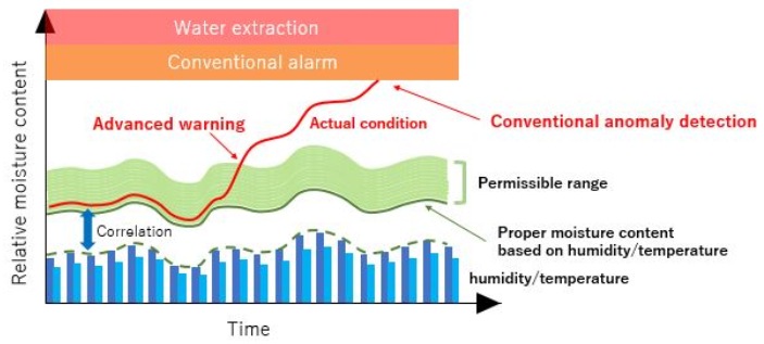 2. About the Advance Water-in-Oil Alarm The advance alarm provides early warning signals when the permissible range between the actual relative moisture content of lubrication oil exceeds the proper moisture content for the surrounding environment based on the temperature and humidity in the engine room. After detection, immediate action can be taken at an early stage. Image of Alarm System: