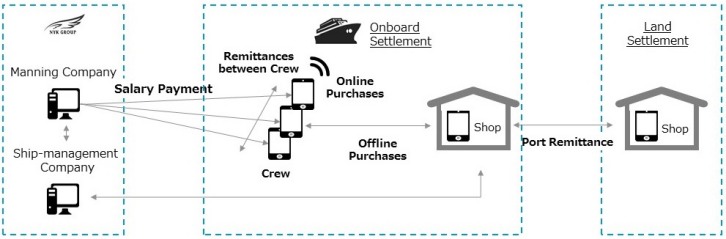 November 21, 2018 As a part of the NYK Group’s medium-term management plan “Staying Ahead 2022 with Digitalization and Green,” NYK is currently considering the establishment of a new network that will enable onboard financial settlements through the remittance of electronic money (e-money). Onboard tests have been conducted to examine the potential to reduce administrative work and the risk of cash loss, and thus foster an employee-friendly workplace where crews can work comfortably and concentrate on ship operations. 1. Background Today, onboard payments are made in cash. Crew members are given a part of their salaries in cash, and daily goods are paid for in cash. The captain must allocate time to oversee payment, inventory, and orders, and crew members must handle cash on board and pay overseas remittance charges to send funds to family members in home countries. NYK estimates that total cash on company ships around the world amounts to about $800 million a year, and costs related to handling are very high. Therefore, as part of the company’s Creative Solutions Startup Support System,* NYK has begun to examine the use of FinTech to realize cashless ships. 2. Cashless Ships Payments by land offices, onboard purchases, and remittances (between crew members and to family members on land) can all be done on board with e-money in a stable communication environment. In addition, cost, time, and risk can be reduced through electronic transactions instead of cash. Cashless Ships