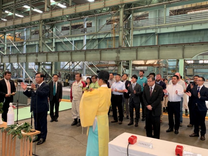 Sep. 24, 2019 NYK has placed an order for the world largest pure car and truck carrier (PCTC) capable of navigating oceans with only LNG as the main fuel. A keel laying ceremony was held on September 20 at Shin Kurushima Toyohashi Shipbuilding Co. Ltd., and NYK managing corporate officer Takaya Soga and other related parties were in attendance. The ship is scheduled to be delivered in 2020 and will be the first large LNG-fueled PCTC to be built in Japan. To minimize a reduction in vehicle loading capacity caused by the installation of LNG fuel tanks, in addition to optimizing major items such as ship width, several designs for maximizing the cargo loading space will be implemented, and the new vessel will be able to transport approximately 7,000 units (standard vehicle equivalent) per voyage. With the support by Japan’s Ministry of Environment and Ministry of Land, Infrastructure, Transport and Tourism for its model project to reduce CO2 emissions by using alternative fuel, the vessel will be installed with the technology to reduce further CO2 emissions and the experimental veri?cation in its actual voyage will be scheduled. The ship will be about 40% more energy efficient (reducing CO2 emissions per unit of transport), far exceeding the International Maritime Organization (IMO) EEDI phase 3 requirements* that will become effective in 2025. The vessel is additionally expected to reduce sulfur oxide (SOx) emissions by approximately 99% and nitrogen oxides (NOx) by approximately 86% compared to conventional heavy oil–fired engines. Air pollution by ship exhaust gas has become an important challenge, and environmental regulations surrounding the shipping industry are being strengthened year by year as environmental awareness increases. LNG fuel can be expected to significantly reduce emissions of air pollutants and greenhouse gases compared to C heavy oil, which is a common marine fuel, and thus meet the SOx Global Cap regulations set by the IMO, scheduled to become effective in January 2020.** From an early stage, the NYK Group has been steadily moving toward using LNG as a propulsion fuel. In fact, in 2016 the group built the world's first LNG-fueled car carrier. That ship entered into service in 2017, and just last year the company began issuing green bonds*** to finance LNG-fueled ships and LNG bunkering vessels, among other green financing projects. NYK will continue to actively work to reduce its environmental burden and realize a sustainable society, as designated in the company’s medium-term management plan “Staying Ahead 2022 with Digitalization and Green.”
