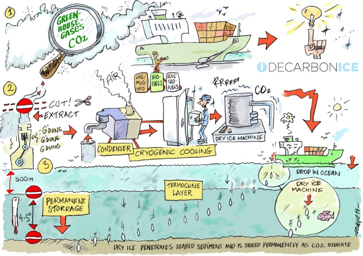 NYK Joins DecarbonICE Project Transforming Exhaust CO2 into Dry Ice to Be Stored in Seafloor Sediments Dec. 04, 2019 NYK has joined the international DecarbonICE project that will be conducting a feasibility study to capture onboard carbon as dry ice and store it in seafloor sediments. The shipping industry is looking for carbon-free solutions to achieve the IMO 2050 target of a 50% CO2 emissions reduction (compared to the 2008 level). In response, new zero-carbon solutions are being developed around the globe, including alternative low-carbon fuels such as LNG fuel that can be used in place of heavy oil. The DecarbonICE project was launched on October 1 by the Denmark-based Maritime Development Center, which has teamed with global shipping companies (including NYK), shipbuilders, and others to conduct a feasibility study on solutions to onboard carbon capture and storage, and to initiate discussions on environmental impact assessments and the IMO-approval process for the technology. During the study, CO2 in the ship exhaust will be captured on board in a cryogenic process and turned into dry ice. It will then be transported into seafloor sediments during normal ship operations. There, the CO2 will be safely and permanently stored as liquid CO2 and CO2 hydrate. The NYK Group is dedicated to achieving the SDGs through the group’s business activities and its medium-term management plan “Staying Ahead 2022 with Digitalization and Green.” NYK will continue its efforts to reduce CO2 emissions through initiatives such as the introduction of new technology and fuel conversion.