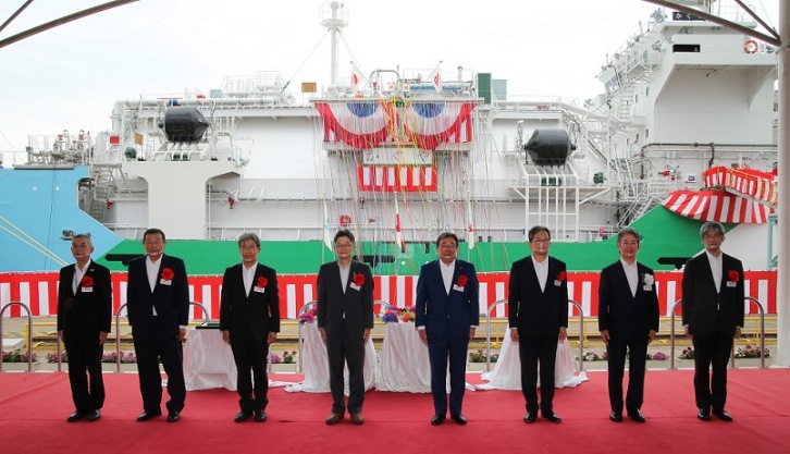 Sep. 18, 2020 Kawasaki Kisen Kaisha, Ltd. JERA Co., Inc. Toyota Tsusho Corporation Nippon Yusen Kabushiki Kaisha On September 16, a naming ceremony was held at the Sakaide Works of Kawasaki Heavy Industries, Ltd. for Japan's first LNG bunkering vessel ("LBV"). The ceremony was attended by Masashi Asakura, Chief Officer for Production Group of Toyota Motor Corporation (head office: Toyota city, Aichi prefecture; President: Akio Toyoda); Masahiro Kato, Deputy Director-General for Engineering Affairs, Ports and Harbors Bureau of Japan's Ministry of Land, Infrastructure, Transport and Tourism; and a number of related parties. LBV was named "Kaguya" by Yukikazu Myochin, President of Kawasaki Kisen Kaisha, Ltd. ("K-Line"), and Hitoshi Nagasawa, President of Nippon Yusen Kabushiki Kaisha ("NYK"), and the ceremonial rope holding LBV in place was cut by Sunao Nakamura, Managing Executive Officer of JERA Co., Inc. ("JERA") , and Toshiro Hidaka, CEO for Machinery, Energy & Project Division of Toyota Tsusho Corporation ("Toyota Tsusho"). LBV's name, Kaguya, derives from Princess Kaguya in "The Tale of the Bamboo Cutter," which is said to be Japan's oldest story and is still loved by many people today. The name also expresses our desire to grow the LNG bunkering market as long and high as a bamboo tree. Kaguya is the first LNG bunkering vessel to be operated in Japan. Kaguya will be operated by Central LNG Marine Fuel Japan Corporation and will be based at JERA's Kawagoe Thermal Power Station. Kaguya will begin supplying LNG fuel* to ships in the Chubu region in October or later this year using Ship-to-Ship bunkering.** The International Maritime Organization (IMO) has agreed on a goal to reduce GHG emissions from shipping by at least 50 percent by 2050 compared to 2008, and the delivery of LNG-fueled ships is expected in the future. After the start of operation, Kaguya will supply LNG to Sakura Leader, which is the first large LNG-fueled PCTC (pure car and truck carrier) operated by NYK, and to a new car carrier to be delivered by K-Line this fiscal year, as well as to other LNG-fueled vessels. The expertise and strengths of each company - including K-Line's technological expertise accumulated through its long-term LNG carrier operations, JERA's operational and technical capabilities at its large-scale terminals, Toyota Tsusho's global sales network for marine fuel, and NYK's experience in the world's first LNG fuel supply and sales business - will be utilized to provide LNG bunkering in Japan's Chubu region and expand our marketing services to promote the use of LNG as a fuel for ships, thereby contributing to a reduction of our environmental impact.