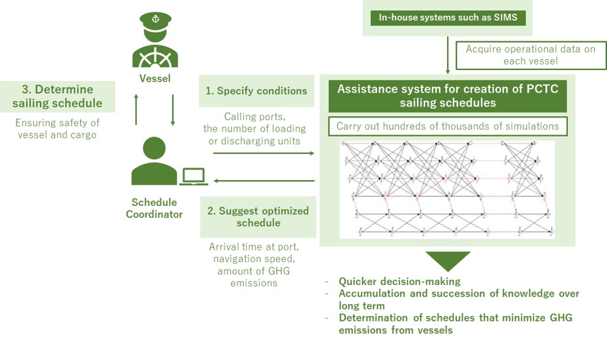 NYK and NBS Develop System for Creating PCTC Sailing Schedules Apr. 15, 2021 NYK and its group company NYK Business Systems (NBS) have developed and implemented a system that assists with the creation of PCTC sailing schedules, thus reducing environmental burden and improving scheduling efficiency. Background Sailing schedules of NYK PCTCs are created after considering several factors, including calling port location, the number of booked units, required arrival dates, and other circumstances such as port congestion and expected weather conditions along the sailing route. However, because vessels call multiple ports to load and discharge vehicles, many manual calculations and much coordination have been required. The heavy workload of schedule coordinators and an unfixed procedure to pass on knowledge to successors have thus become long-term concerns requiring improvement. To address these issues, one of NYK's digitalization initiatives has been to work with NBS to develop a system that assists with the creation of sailing schedules. Overview of the System The system works to assist schedule coordinators with the efficient determination of sailing schedules by suggesting optimized schedules that may not be realized through conventional manual calculations. The system acquires operational data on each vessel from other in-house systems such as SIMS.* Once the conditions are specified, such as calling ports and the number of loading or discharging units, the system promptly carries out hundreds of thousands of simulations that include multiple inputs - such as the most appropriate arrival time at port and most suitable navigation speed - to eventually obtain an optimized schedule that best suits each vessel navigating multiple ports. Utilization of this system enables quicker decision-making, as well as the accumulation and succession of knowledge over a long term. In addition, this system is expected to contribute to helping NYK's PCTC services address climate change by enabling the determination of schedules that minimize GHG (greenhouse gas) emissions from vessels.