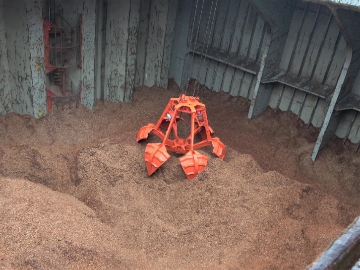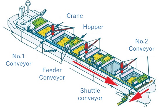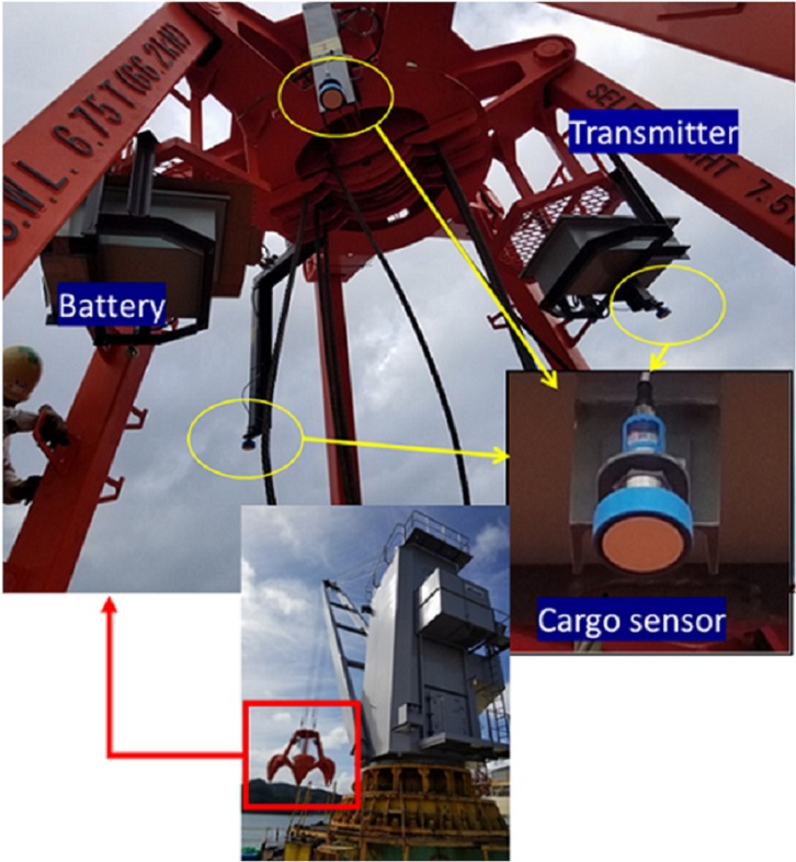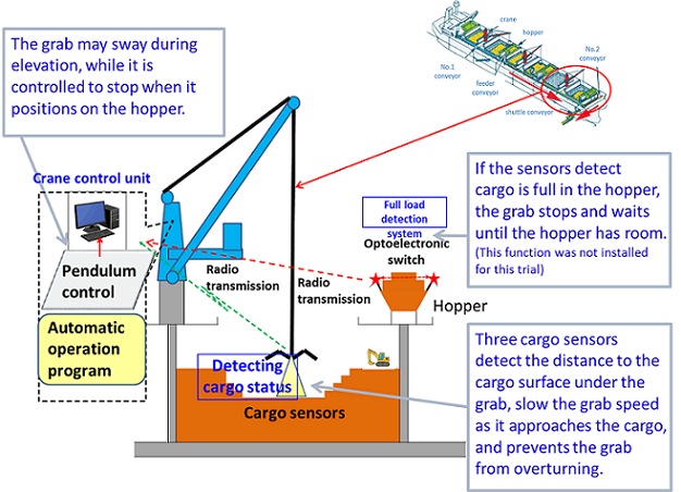 Outline of cargo handling trial The crane automatic operation system is designed to carry out discharging work once a crane operator uses an operation panel installed in the cab of the onboard crane to select one of the pre-set types of routine movements. Three sensors attached to the grab detect the surface of the cargo loaded in the cargo hold, and they wirelessly transmit a signal to the crane. The grab then rolls down, slows down its speed as it approaches the surface of the cargo, and lands on the cargo. For the sake of safety and efficiency, the system is equipped with a grab fall-prevention function and a hopper full-load detection sensor.