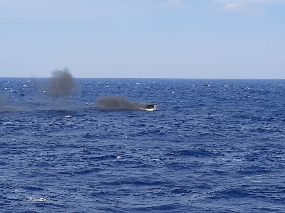 The fishing vessel, No. 28 Katsu Maru, on fire. Image by NYK Group.