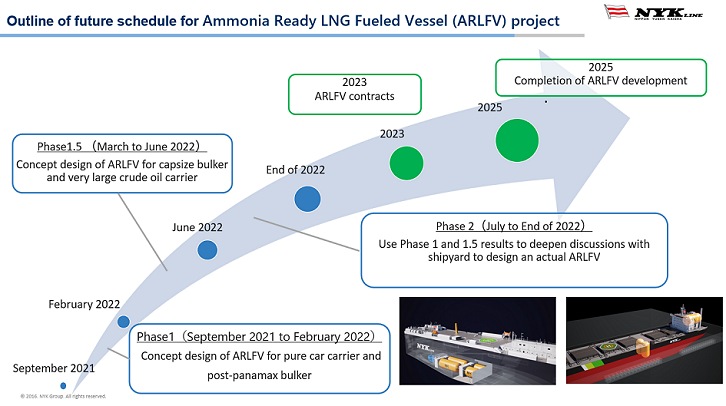 Concept design of ARLFV. Image by NYK. Future Schedule During Phase 1.5, which will continue until June 2022, we will design a similar concept for a capesize bulk carrier and a very large crude oil carrier. Furthermore, until the end of 2022 in Phase 2, we will proceed with the actual design of an ARLFV with a shipyard and marine manufacturers, reflecting the results obtained in the concept design, such as the optimal fuel-tank layout, ammonia-fuel supply device, and structural strength of the hull. This project will be completed when the actual ship design is completed, Afterward, we will propose to customers and business partners a transportation service that can transition trouble-free from an LNG-fueled vessel to an ammonia-fueled vessel through use of an ARLFV. We plan to offer customers ARLFV contracts in 2023 and aim to complete building the first ARLFVs in 2025.
