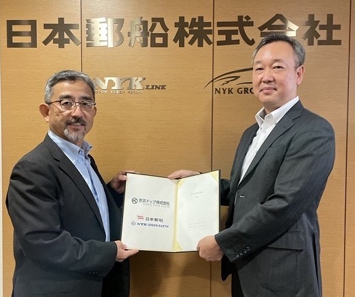 From left, Toshiya Kozawa, President, Keihin Dock Co., Ltd.; Tsutomu Yokoyama, General Manager, Green Business Group, NYK. Face masks were removed immediately prior to the photo. Image by NYK.
