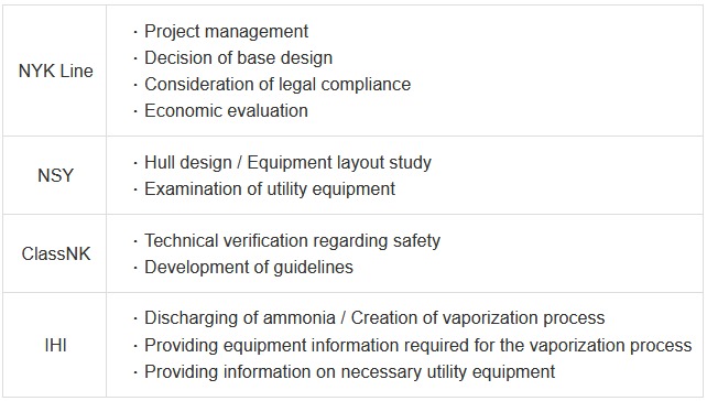 Image by NYK Top row, left to right: General Manager, Green Business Group, NYK Line, Tsutomu Yokoyama General Manager, Research & Development Department, Design Division, Nihon Shipyard Co., Ltd., Nobutaka Umeyama Bottom row, left to right: General Manager, Technical Solution Department, ClassNK, Hiroshi Shibako Deputy General Manager, Carbon Solution Business Unit, Division Director of Engineering Center, IHI Corporation, Shinichi Takano Future Outlook The parties will promote R&D with the aim of becoming a solution for introducing ammonia fuel mixed combustion to coal-fired power plants that domestic electric power companies are currently working on. * Barge A barge is a flat-bottomed vessel designed to carry heavy cargo mainly in inland waterways and ports. Almost all barges cannot navigate by themselves because they are not equipped with an engine; they must be towed or propelled by a tugboat. Overview of each company NYK Line Headquarters: Tokyo President: Hitoshi Nagasawa Website: https://www.nyk.com/english/ Nihon Shipyard Co., Ltd. Headquarters: Tokyo President: Yoshinori Maeta Website: https://www.nsyc.co.jp/en/ ClassNK Headquarters: Tokyo President & CEO: Hiroaki Sakashita Website: https://www.classnk.com/ IHI Corporation Headquarters: Tokyo President & CEO: Hiroshi Ide Website: https://www.ihi.co.jp/en/ NYK Group, press release