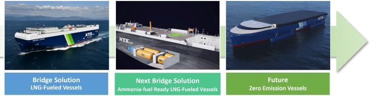 A "concept design" includes ship specifications such as overall length and width, load capacity, voyage distance, ship speed, etc, for a vessel building. NYK has set a long-term target of net-zero emissions of greenhouse gas (GHG) by 2050 for the NYK Group's oceangoing businesses, and aims at launching zero-emission ships that run on low-environmental-load marine fuels, such as ammonia or hydrogen, in the future. NYK is positioning LNG, a low-carbon marine fuel, as a bridge-solution until future zero-emission ships are realized, and has thus been expanding its fleet of LNG-fueled vessels.