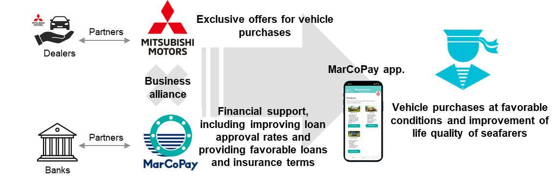 Image by NYK. 1. Special MMPC page MMPC and MarCoPay Inc. will help seafarers to research the purchase of new Mitsubishi Motors vehicles and apply for a MarCoPay-affiliated loan through a special MMPC page in the MarCoPay app. 2. Exclusive benefits MMPC and MarCoPay Inc. will allow seafarers to enjoy unique advantages when they purchase a Mitsubishi vehicle through the MarCoPay-affiliated loan. Aiming to provide convenience and to enrich the lives of seafarers, the two companies will collaborate to continuously offer exclusive promotions and services which can only be experienced through this type of loan. 3. Advertisement placement MMPC and MarCoPay Inc. will place advertisements for seafarers in the MarCoPay app and external advertising media used by MarCoPay Inc. In addition, the two companies will participate in seafarers' meetings in the Philippines to publicize their services and partnership. Image of the alliance