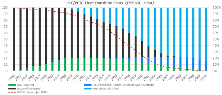 Image by NYK. * Nanjing Jinling Shipping Co., Ltd. China Head Office: Nanjing, People's Republic of China; Business: Shipbuilding; Website: http://jlshipyard.sinotrans-csc.com/col/col4261/index.html ** Sail GREEN A brand that emphasizes NYK's efforts to reduce GHG emissions through the transport of goods and contribute to the eco-friendly supply chains of customers, regardless of the mode of transport (e.g., by sea or land, through terminals, etc.). NYK's PCTC Fleet Composition Transition Plan (2020-2050) (as of March 2022)