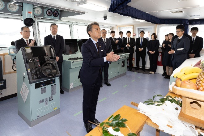 Shinto ceremony to purify and bless the vessel. Right, Takashi Mitsuyoshi, President, KEYS Bunkering West Japan Corporation. Image by NYK Group.