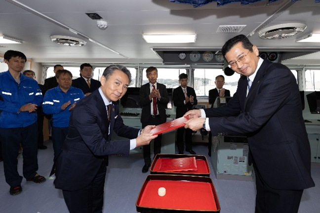 Delivery notice / receipt exchange. Right, Koji Mori, Executive Officer, Mitsubishi Shipbuilding Co., Ltd.; left, Takashi Mitsuyoshi, President, KEYS Bunkering West Japan Corporation. Image by NYK Group. Vessel Particulars LOA: 82.4 meters Beam: 18.2 meters Draft: 4.8 meters Gross Tonnage: 4,744 tons LNG Loadable Capacity: 3,500 cubic meters Driving Power: Electricity (dual-fuel engine (consuming LNG or fuel oil)) Builder: Mitsubishi Shipbuilding Co., Ltd.