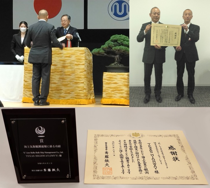 The Japan Meteorological Agency (JMA) presents the Minister of Land, Infrastructure, Transport and Tourism Award and the Director-General of the Japan Meteorological Agency Award to vessels engaged in maritime weather observation and reporting every June 1*1 which is the Meteorological Memorial Day. The "K" LINE Group will continue to contribute to the development of meteorological services in Japan by providing maritime observation data to the JMA. *1 Meteorological Memorial Day: The Tokyo Meteorological Observatory, the JMA's predecessor, began Japan's first meteorological and seismological observations on June 1, 1875. To commemorate this event, the Central Meteorological Observatory declared June 1 to be Meteorological Memorial Day in 1942. The annual Meteorological Memorial Day ceremony honors individuals and organizations that have significantly contributed to meteorological services. This year marks 149 years since the Tokyo Meteorological Observatory began its observations.
