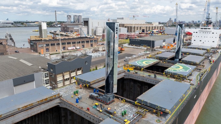 23 July 2024 On July 8, NYK Bulkship (Atlantic) N.V. (Head Office: Antwerp, Belgium; "NBAtlantic"), an NYK Group company, installed two wind-assisted ship-propulsion units on the bulk carrier NBA Magritte at the port of Rotterdam, the Netherlands, which is engaged in a long-term charter contract with Cargill (USA). This is the first time a unit of this type has been installed on an NYK Group vessel. Sitting on a 20-foot-long (approximately 6-meter) flat rack container with no walls, VentoFoil has a 16-meter vertical wing that acts as suction sail* which expects about 5 times as much force compared to no-suction versions.