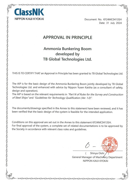 TBG is Japan's top manufacturer of cargo-handling equipment for crude oil, liquefied natural gas (LNG), and other liquids. NYK and TBG will significantly enhance the safety of supplying ships with ammonia, which is highly toxic, by employing TBG's technology to ensure the liquid does not leak. Ammonia is expected to contribute to the decarbonization of ships because it does not emit CO2 when burned. The most distinctive feature of the boom is a TBG-developed emergency-release system that allows the connection between an ammonia-fueled vessel and an ammonia bunkering vessel (ABV) to be disconnected instantly in an emergency. In acquiring the AiP, NYK provided design data for its in-house developed ABV. In addition, to improve the safety and operability of the equipment, NYK provided knowledge on the handling of ammonia gained by NYK from its ammonia-transport business and expertise gained from Kaguya, Japan's first LNG bunkering vessel. Kaguya is operated by Central LNG Marine Fuel Corporation, of which NYK is the largest shareholder. Ammonia-fueled vessels are being researched and developed worldwide as next-generation fuel vessels friendly to the natural environment. One such vessel, an ammonia-fueled medium gas carrier (AFMGC) scheduled for delivery in November 2026, is being developed by a consortium** that includes NYK.
