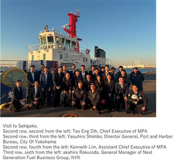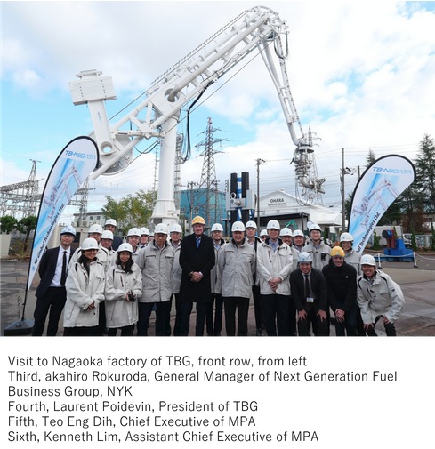 Nov. 26, 2024 On November 25, Teo Eng Dih, Chief Executive of the Maritime and Port Authority of Singapore (MPA), and Kenneth Lim, Assistant Chief Executive of MPA, visited the Nagaoka factory of TB Global Technologies Ltd. (TBG) in Niigata, Japan. NYK is jointly developing bunkering boom, a device used to supply ammonia between ships with TBG. MPA delegation also visited the ammonia-fueled tugboat Sakigake - developed, built, and operated by the NYK Group and now under three-month demonstration period in Tokyo Bay -, and observed the ammonia-fueled engine and other equipment. In July, MPA and NYK signed a memorandum of understanding to promote the sustainable development of the maritime industry in Singapore. Both parties agreed to work together to promote the use of clean fuel ammonia for vessels, including bunkering vessels operating in Singapore, and to consider training programs for seafarers on ammonia-fueled vessels. MPA delegation visited the Nagaoka factory of TBG to observe the bunkering boom planned to be installed on the ammonia-bunkering vessel that NYK is developing. NYK and TBG are jointly developing the bunkering boom, which uses TBG's technology to minimize the risk of ammonia leakage and safely supply ammonia between ships. During the Sakigake visit, MPA delegation observed the ammonia-fueled engine and related equipment. This tug was jointly developed by NYK and IHI Power Systems Co., Ltd. after being selected as a Green Innovation Fund project by Japan's New Energy and Industrial Technology Development Organization (NEDO). The vessel was completed in August and has since been engaged in towing operations in Tokyo Bay during a three-month demonstration period as the world's first commercial-use ammonia-fueled vessel. Sakigake incorporates several safety designs for using fuel ammonia and is thus expected to contribute to the spread and expansion of the use of fuel ammonia in ships, including bunkering vessels. NYK is developing ammonia bunkering businesses in Singapore and other major bunkering ports in Japan and overseas. NYK will continue to cooperate with MPA in various initiatives aimed at the sustainable development of the maritime industry, utilizing the knowledge and technology gained through research and development of ammonia-fueled ships and fuel-ammonia supply equipment.