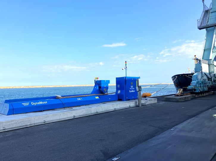 DynaMoor is a mooring system that reduces ship sway and surge while the vessel is at berth. Trial operations using actual ships have begun, and this is the first time the system has been used in Japan. The two DynaMoor units in this trial have been installed at the above berth and will be tested for one year. A motion sensor will be attached to berthed vessels to measure vessel-hull sway and surge when using DynaMoor, and the effectiveness of reducing the motion of berthed vessels and improving the safety and efficiency of port operations will be verified.