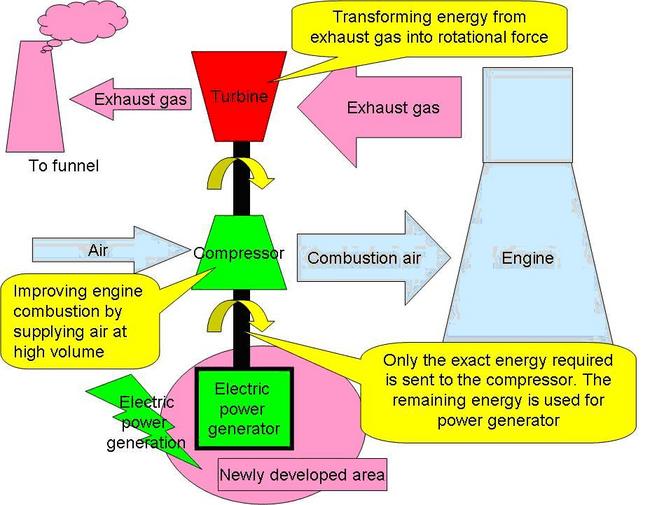In addition to these basic functions, a hybrid turbocharger utilizes the extra rotational power generated by the turbine for electric power generation. Shin Koho can meet all its onboard electric power requirements for normal operation by using a hybrid turbocharger instead of diesel generators and by reducing the use of the diesel generator, the hybrid turbocharger contributes to a further reduction of CO2 emissions.