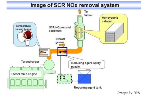 It was initially thought that SCR NOx removal equipment would find it difficult to respond to future NOx emission controls because in an atmosphere of low-temperature exhaust gases below 300 C, ammonium hydrogen sulfate (acid ammonium sulfate) — generated by the chemical reaction of the sulfur in fuel oil with the ammonia in the reducing agent — poisons catalysts. However, the new SCR NOx removal equipment has been improved to reduce catalyst poisoning to a minimum level by suppressing the sulfur in fuel oil to approximately 0.1 percent. As a result, in an atmosphere of low-temperature exhaust gases at 250 C after turbocharging, stable denitration effects were observed during a test on land, which led to shipboard tests on an operational vessel with an eye to practical use. Given the heightened awareness of environmental issues, NYK Line is proactively involving itself in reducing the environmental impact caused by its vessels. Oshima Shipyard, MHI, Akasaka Diesels, and Sakai Chemical have initiated, as a high-priority issue, R&D that focuses on future environmental regulations to be imposed on vessels. Since fiscal 2007, these companies have participated in the “R&D on Super Clean Marine Diesels” initiative, which is subsidized by The Nippon Foundation, and conducted by the Japan Marine Equipment Association under the leadership of the Ministry of Land, Infrastructure, Transport and Tourism. In addition, since fiscal 2010 the companies have also been involved in developing technology for a denitration system that will work with low-temperature exhaust gases of low-speed marine diesel engines, including shipboard tests, with technical cooperation from the National Marine Research Institute. Against this backdrop, NYK Line decided to cooperate in this research with the trial installment of SCR equipment on its own operating coal carrier. The five companies will continue R&D activities related to the environmental field so as to contribute to the reduction of the environmental impact of the global marine industry. * IMO Tier III NOx Emission Controls The IMO-adopted MARPOL Convention is the main international convention covering the prevention of the pollution of the marine environment by shipping. In line with MARPOL Annex VI (Regulations for the Prevention of Air Pollution from Ships) that came into effect on May 19, 2005, NOx emission controls (tier I controls) for diesel engines installed on vessels were implemented in Japan. Later the convention was revised and a new NOx emission level (tier II controls) came into force on July 1, 2010. The revised regulation is a very strict one that aims to decrease NOx emission levels by a further 20 percent from that of the first regulation. Moreover, the third control was adopted in 2008, targeting vessels to be constructed from 2016 and limited to emission control areas, to seek the reduction of NOx emissions by about 80 percent from that of the first tier. NYK Line, press release |