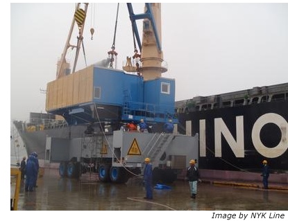 The multipurpose heavy load carrier INABA owned by NYK-Hinode Line, Ltd., an NYK group company, called at the Port of Ofunato in Iwate Prefecture, Japan, on September 21 to unload a self-propelled harbor crane?that had been transported from the Port of Antwerp, Belgium.