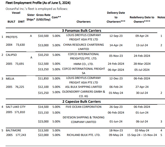 Athens, Greece - June 6, 2024 OceanPal Inc. (NASDAQ: OP) (the "Company"), a global shipping company specializing in the ownership of vessels, today reported time charter revenues of $5.7 million, net loss of $1.3 million and net loss attributed to common stockholders of $1.7 million for the first quarter of 2024. This compares to time charter revenues of $3.9 million, net income of $88 thousand and net loss attributed to common stockholders of $472 thousand for the first quarter of 2023.